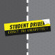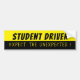 Una calcomanía de advertencia amarilla y negra para instructores de autoescuela para que los vehículos detrás de ellos sepan que un conductor inexperto está detrás del volante. El texto principal dice "Conductor Estudiante" en letras negras en negrita. El texto secundario dice "¡Espera lo inesperado!" en letras mayúsculas más delgadas y amarillas.