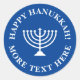 Calcomanías y sellos de sobre personalizados Feliz Janucá. Cree sus propios sellos de sobre personalizados y selladores de favores de fiesta. Agregue su propio texto alrededor del logotipo del candelabro de la menorá. Plantilla azul y blanca para las fiestas judías.
