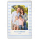 Make this calendar your family calendar in 2026 and use it to plan a wonderful year and stay on top of things. This calendar's design theme is light blue and pink stripes and gingham patterns all throughout. Each month gets a different pattern and a single horizontal family photo template. The cover sets the tone with a lovely hand-drawn light blue horizontal stripes pattern on top of which sits a light cream vertical container for your vertical family photo followed by your name and year in modern sans serif blue font. The back is of the same blue, a dark shade of blue. These stripes and gingham patterns are lovely because they were hand-drawn, therefore imperfect and stylish.