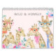 ilustracion de color de agua de familias animales de jirafas, elefantes, ciervos, animales de bosque, aves, leones, pingüinos, flamencos y osos panda gigantes. Tema "Salvaje y Homely".