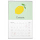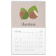 Un calendario de 12 meses con una fruta diferente para cada uno y fondo pastel. ¡Un buen regalo para los vegetarianos, un cocinero o un jardinero! El calendario incluye limón, plátano, higo, manzana, fresa, cereza, arándanos, ciruela mirabelle, avellanas, nueces, castañas, naranja y un núcleo de manzanas.