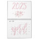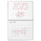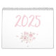 Calendario mural moderno 2025 con hermosos ilustraciones de rosas y texto de escritura rosa escrito dentro del calendario.