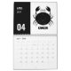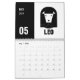 Un calendario creativo con 12 signos de zodiaco védico en diseños geométricos inspirados en sus significados originales; animal, ave, criatura marina o forma humana, arreglado mes a mes según la astrología védica tradicional.
