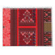 El diseño parece ser un diseño textil, posiblemente para tela o papel pintado. Aquí hay una descripción detallada: Sección superior: Tiene un fondo rojo con franjas verticales en blanco y negro, intercalado con patrones intrincados que se asemejan a diseños tradicionales o tribales. Banda central: Esta sección presenta formas de zigzag y diamante en negro, blanco y tonos marrones, flanqueados por finas franjas verticales. Sección inferior: Muestra un patrón ornamentado, paisajista en tonos rojos con un motivo central prominente que refleja la forma de la parte superior pero con detalles más elaborados. El diseño es bastante complejo y llamativo desde el punto de vista visual, con una mezcla de motivos geométricos y orgánicos. Podría ser culturalmente importante, especialmente en el contexto del diseño textil.