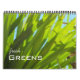 Fresh Greens es un calendario lleno de fotografías originales de hojas y otros vegetales naturales. Las fotos son vistas más cercanas de hojas de palmera, hojas de elefante, hierbas marinas e incluso la albahaca de hierbas. Los colores verdes van desde verde claro amarillo y verde limón tropical hasta verde oscuro del bosque. Algunas hojas son resaltadas por la luz del sol, otras están en la sombra y ocasionalmente trozos de cielo azul tropical llegan a través. Este es un calendario para recordarnos cada mes a pensar verde, a vivir verde.