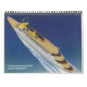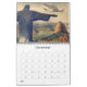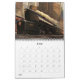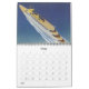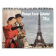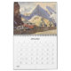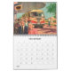 Calendario de viajes de ilustracion vintage de 12 meses con escenas de viajes que incluyen cruceros, aviones, trenes, autos y un depósito de autobuses.
