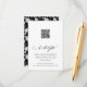 Elegante diseño de caligrafía con un marcador de posición de código QR en la parte delantera y un patrón floral en blanco y negro en la parte posterior.