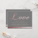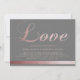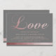 Elegante y elegante, sencilla invitación a la caligrafía con toques dorados subió. Diseño moderno con escritura personalizado "amor" en oro rosa con fuente moderna para toda la información y borde oro rosa en la parte inferior sobre un fondo gris