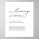 Esta Señal de Boda de Caligrafía Moderna en Memoria Amorosa es una forma hermosa y elegante de honrar y recordar a seres queridos que han fallecido en su día especial. Con un diseño simple y minimalista con una fuente de caligrafía moderna, esta señal de memorial de boda se integrará perfectamente en cualquier decoración de boda. El eslogan "Siempre en Nuestros Corazones" añade un toque emotivo y sentimental a esta señal de memorial y la señal es personalizable con los nombres de sus seres queridos. Para personalizar, simplemente haga clic en "Personalizar" e ingrese sus datos. Eche un vistazo al resto de la colección para ver todos los artículos coincidentes disponibles en este hermoso diseño.