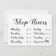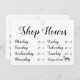 Las horas de apertura para la ventana colgante de la tienda minorista o la señal de la puerta de cristal le permite a sus clientes saber cuándo está abierto y cerrado. Extraiga el área de hoyo redondo con un punzón de papel y cuelgue su puerta con cinta o cuerda de yute en un vaso de succión de ventana.