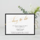 En esta pieza distintiva, se utilizó una fuente de caligrafía elegante para crear un gráfico que dice "cambiar la fecha". La imagen ha sido adornada con un efecto dorado metálico falso. Se han agregado franjas doradas coordinadas que crean una especie de banda para un resultado discreto y sofisticado. Utilice los campos de la plantilla para agregar sus datos personales. El fondo y el texto del cuerpo se pueden cambiar a cualquier color que prefiera. Por favor, comuníquese con nosotros para cualquier solicitud especial o para obtener ayuda para personalizar. // 141 //
