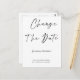 Estas personalizados modernas y sencillas tarjetas Change the Date son una forma elegante de notificar a sus invitados el cambio de fecha. El diseño moderno incluye Cambiar la fecha, sus palabras, nombres y fecha especial en escritura y tipografía en negrita. La espalda tiene una nota para su familia y amigos. Haga clic en "personalizar esta plantilla" para cambiar toda la redacción a la suya. Por favor vea nuestros otros diseños coincidentes en nuestra tienda. Si necesitas ayuda con la personalización o solicitudes especiales, por favor envíame un correo electrónico a ybnormalone @gmail.com. Gracias por detenerse en www.zazzle.com/Personal_Creations. ©Karen Hall for Personal_Creations at Zazzle.