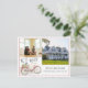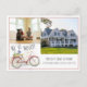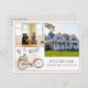 Bicicleta roja vintage con una cesta de flores, acuarela nueva tarjeta de invitación para el hogar. "Nos hemos mudado", cambio de tarjeta de dirección con dos fotos. Sube dos de tus fotos de casa favoritas y personaliza el texto con tu nueva dirección.