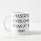 El diseño de la taza de café que dice "Cambiando vidas de un préstamo a la vez" lo hace ideal para un experto hipotecario que a veces ama tomar café o té.