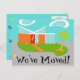 Esta postal de cambio moderno de dirección de mediados del siglo Personalizable le hará desear sacar la alfombra de BIENVENIDA y sentirse como en casa. El diseño artístico minimalista de los años 60 se compone de una elegante casa de piedra naranja y de cristal acuático sobre un frondoso césped verde en forma de boomerang. El césped forma un oasis en medio de su entorno gris y de hormigón. Una palmera verde se balancea en la brisa. Cuatro escalones de piedras naranjas conducen a la puerta trasera, roja y retro, con tres cristaleras rectangulares. A la izquierda de la puerta, una maceta de flores turquesa acoge una planta tropical verde. La casa tiene un techo blanco inclinado en forma de V que apunta hacia dos nubes blancas con forma de riñón. El cielo es una sombra positiva de agua. La parte delantera de esta carta dice: "¡Nos hemos mudado!" Personalice el lado opuesto con su nueva información de contacto. ¡Nadie querrá tirar piedras de esta moderna casa de cristal! ¡Compra este producto kitschy de la edad espacial y sé el gato más genial de tu bloque!