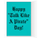 Hable como una tarjeta de felicitación del pirata que ofrece el arte del public domain del ilustrador y del escritor pirata-temáticos conocidos, Howard Pyle. ¡La tarjeta lee con el capitán que dice, "Avast! Si YE rechaza hablar como un pirata, después YE caminará como un pirata, scallywag de YE," y el miembro de equipo responde, "la empuja encima de su botín, Captain el Uno-cangrejo. Cómo es eso para un comienzo?"