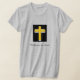 La cita religiosa y la cruz de oro en la camiseta gris de la mujer fueron inspiradas mientras buscaban respuestas bíblicas a un asunto personal. El mensaje: Nunca estamos solos. Dios, Creador, Espíritu, Jesús, sea cual sea el nombre que escojamos usar, siempre está caminando a nuestro lado. ¡Gracias por comprar con nosotros!