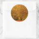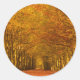 Pegatina fotográfico redondo de un camino a pie a través de los árboles de hayas doradas en un bosque con colores otoñales en la temporada de otoño en los Países Bajos.