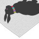 Este corredor de mesa tiene una fila de conejos de silueta negra sentados con orejas altas usando un anillo de flores coloridas alrededor de sus cuellos sobre un fondo gris claro.