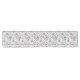 Este corredor de mesa presenta un bonito jardín de cabañas con motivos florales en tonos suaves de rosa, azul y crema sobre azul claro.