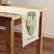 Obras de arte en tonos pastel que representan elegantes flores crema e hidrangea blanca con sus capullos sobre un fondo verde mudo sobre un amarillo pálido decoran los extremos de este corredor de mesa junto con textos que pueden ser personalizados.