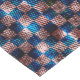 El diseño rústico del tablero de ajedrez es diferente, con un aspecto lleno de arañazos cruzados en tonos salmón y azul que pueden dar lugar a la percepción de partes torcidas o abultadas.