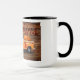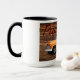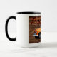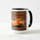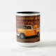 Diseño único de taza con un camión antiguo pintado de naranja lleno de calabazas de caída con fondo de textura de madera. Personalice agregando su nombre.