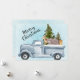 Tarjeta plana con un diseño festivo de Navidad. Un camión de acuarela que transporta pinos de Navidad junto con algunos animales del bosque. Un oso, un zorro y un ciervo que están de pie en la parte trasera yendo de paseo.