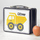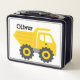 Caja de almuerzo personalizada para tu niño que ama los vehículos de construcción de camiones de volteo amarillos. Puedes cambiar el texto, el estilo de fuente y el color.