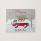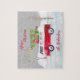 Camión Rojo Feliz Navidad Gris rompecabezas. Personalice agregando su apellido y cambiando la frase Feliz Navidad. Elementos coincidentes disponibles.