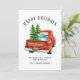 Rustic Red Truck Happy Holidays Christmas Tree Holiday Card. Esta casa de campo presenta un diseño inspirado en un camión rojo vintage con un árbol de Navidad y regalos de Navidades en la parte trasera. La tarjeta dice "Felices Fiestas" en simple tipografía mínima. Personaliza fácilmente con tu nombre, año y mensaje de vacaciones en la parte delantera y trasera de la tarjeta.