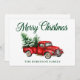 Una hermosa tarjeta de vacaciones con un guión moderno de caligrafía Feliz Navidad con un camión rojo de color de agua, árboles de navidad y nieve.
