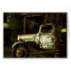 Camión viejo, destrozado en pueblo fantasma por la noche con pintura ligera.