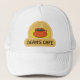 © Sunny Mars Designs. Coffee Cup Cafe Trucker Hat - gorra o gorro de café Guay con un moderno, moderno, elegante, lindo, estilizado diseño de un icono de ilustracion gráfico de una taza de vapor o una taza de café y platillo. Personalizar esto agregando tu propio texto, nombre o nombre de café o comprándolo como está.