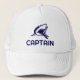 Nombre personalizado capitán de barco capitán sombrero de camionero con logo de tiburón. Plantilla moderna de tipografía para marinero, pescador o patrón. Haga su propio gorro personalizado para pescar, navegar o pasear en bote. Colores náuticos azul marino y blanco. Idea de regalo de cumpleaños masculino de Guay o Día del Padre para hombres. Haz lo tuyo por papá, tío, padre, hermano, esposo, abuelo, etc. Ropa de cabeza personalizado para el verano. Silhouette de animales oceánicos. Dibujo de mordedura de tiburón.