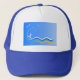 © Sunny Mars Designs - Surf Abstract Trucker Hat - Este fresco personalizado abstracto de surf impreso unisex míos y gorra femenina presenta una silueta blanca de un surfista surfeando una ola con gaviotas volando sobre un fondo azul.