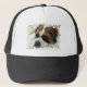 Perro de St Bernard que miente en el gorra de béisbol de la nieve.