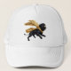 Un león negro volador con una capa de oro está en un gato de béisbol.