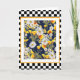 La hermosa y artística imagen presenta toneladas de coloridas margaritas blancas y manzanas naranjas sobre fondo negro con borde de tablero de ajedrez en blanco y negro