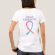 La toma de conciencia de la muerte de un bebé usa una cinta rosa y azul para crear conciencia sobre su causa. El arte de la camisa muestra un cuadro de arte de la cinta de reconocimiento azul y rosa. El mensaje de la camiseta de sensibilización dice "Conciencia sobre la muerte". Hay una gran imagen en la parte posterior de la camisa y una imagen más pequeña en la parte delantera de la camisa. El NIH explica la pérdida de embarazo como "cuando un embarazo termina inesperadamente antes de la semana 20. A veces se le llama pérdida del embarazo precoz, pérdida del embarazo a mitad de trimestre, aborto espontáneo, o desaparición fetal". El NIH afirma que "la muerte de un feto en la vigésima semana de embarazo o después de ella". La ropa artística de la cinta de concientización puede ser personalizada con mensajes personalizados para hacer ropa de evento de gran causa para camisetas de recaudación de fondos, camisetas de caminatas del equipo de grupo, regalos de camisetas de concientización u otros eventos de causa especial para la mercadería, para ayudar a aumentar la conciencia de la causa en el público por la ayuda de la sociedad para crear ayuda y causar cambio.