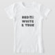 Esta camiseta presenta un diseño audaz y patriótico con la frase "RED WHITE & TRUE" en letras mayúsculas. Encima del texto hay una imagen de la bandera de los Estados Unidos en escala de grises. El diseño evoca un sentido de orgullo nacional y es perfecto para aquellos que quieren mostrar su amor por Estados Unidos. Esta camiseta, hecha con tejidos de alta calidad y cómodos, es ideal para el desgaste casual y hace una declaración fuerte.