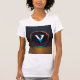 La pieza central de la camiseta es un ilustracion maravillosamente detallado de un astronauta flotando serenamente en el espacio. El astronauta se representa en una posición relajada, con brazos y piernas ligeramente repartidos, lo que transmite una sensación de calma y asombro. La visera del casco refleja una vista impresionante de la Tierra de abajo, con tonos azules y verdes vibrantes que contrastan con el negro profundo del espacio. Alrededor del astronauta hay elementos cósmicos etéreos como nebulosas, estrellas y galaxias, representadas en una mezcla de colores brillantes e irrisorios que se desprenden del fondo oscuro de la camisa. Este paisaje cósmico crea una sensación de movimiento y profundidad, invitando al espectador a perderse en la vastedad del espacio.