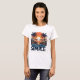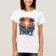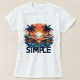 Su diseño de camisetas presenta una vibrante escena tropical con palmeras, olas del océano y una impresionante puesta de sol o amanecer. Los colores son una hermosa mezcla de azules, naranjas y blancos, creando un sorprendente contraste. La palabra "SIMPLE" se integra audazmente en el paisaje, añadiendo un toque único. El diseño es simétrico y está enmarcado en un borde circular, lo que lo hace visualmente atractivo y equilibrado.