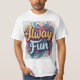 Diversión geométricaUna camiseta audaz y elegante con la frase "siempre divertido" en colores contrastantes contra un fondo de patrón geométrico.