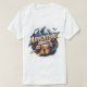 "La aventura espera, ve a buscarla". Usar tipografía audaz y aventurera con bordes agudos y angulares, dando al texto un sentido de movimiento y emoción. Rodear la frase con elementos vibrantes y contrastantes como picos de montaña jaleados, un río sinuoso que fluye a través del diseño, y una gran brújula detallada con bordes brillantes para llamar la atención