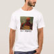 This t-shirt features a realistic image of the Marvel character Deadpool sitting at a table with a stack of pancakes in front of him. Deadpool is wearing his signature red and black suit with a harness and swords on his back. He is holding a fork and knife in his hands and appears to be ready to eat the pancakes. The pancakes are stacked high and have syrup dripping down the sides. The background is a dark green color with a spotlight on Deadpool and the pancakes.