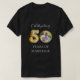 Para una camiseta de color negro/oscuro. Personaliza y agrega tu foto. Texto: Celebrando 50 años de matrimonio. El número 5 se escribe con un tipo de letra de estilo globo. Falso marco de foto de aspecto dorado.
