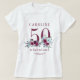 Elegante feminista 50 y fabulosa fiesta de cumpleaños camiseta personalizada con acuarela de color rojo burdeos y polvorientas flores azules y una moderna escritura tipográfica.