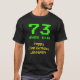 Este diseño de camisa nerd y tonto muestra el mensaje "¡73 AÑOS!", el mensaje de bienvenida de cumpleaños "Feliz cumpleaños número 73", y un nombre personalizado. Los dígitos de la edad superior y el texto tienen un estilo gráfico geek, pixelado, verde y de 8 bits inspirado en el de los juegos de computadoras de la vieja escuela y los videojuegos de los años 80. El mensaje de saludo inferior tiene un aspecto nerd, amarillo, clásico, inspirado en la informática digital. Camisetas como este pueden ser usados por los asistentes a una fiesta de cumpleaños realizada en celebración del 73 cumpleaños de alguien a quien realmente le gustan los videojuegos retro o las computadoras vintage. [~Z0000455]