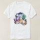 A gorgeous cat sleeps in the desert with amethyst crystals and cactus in the desert